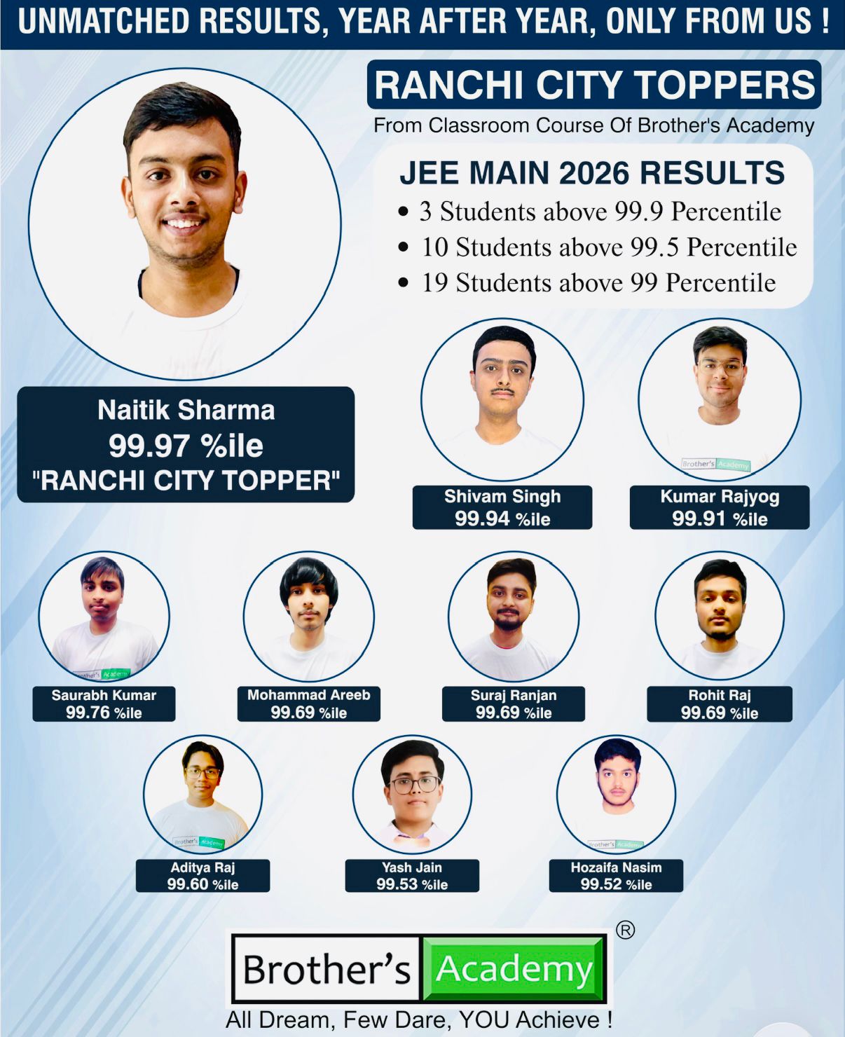 Brother's Academy is a Premier coaching Institute in Ranchi that was started in December-2011 with the noble idea of providing quality education and the best coaching facilities to students of Jharkhand and Bihar. The foundation was laid by Renowned faculties Paras Kumar Agarwal Sir, Prem Prasoon Sir and Shubhendu Shekhar Sir. With a legacy of over 14 years, Brother's Academy has pioneered competitive exam preparation. We have been at the forefront in preparing students to achieve their goals of cracking Engineering entrance examinations. With our expert faculty and unmatched study material, Brother's Academy produces top rankers in IIT-JEE, Olympiad, 10th and 12th Boards every year.Ours is a value system that runs on Truth, Dedication & Hard Work. We firmly believe that to build a strong structure we need to have a very solid foundation and we, at Brother's Academy have worked very hard on it. We feel proud today that we have earned a separate identity in the crowd of this city. All this has been possible through the hard work of our team, dedicated labour of our students and the trust & faith that their parents have shown in us. We are also committed towards the upliftment of teaching standards in the city and this is the reason we decided to make a very separate space for us in the society.