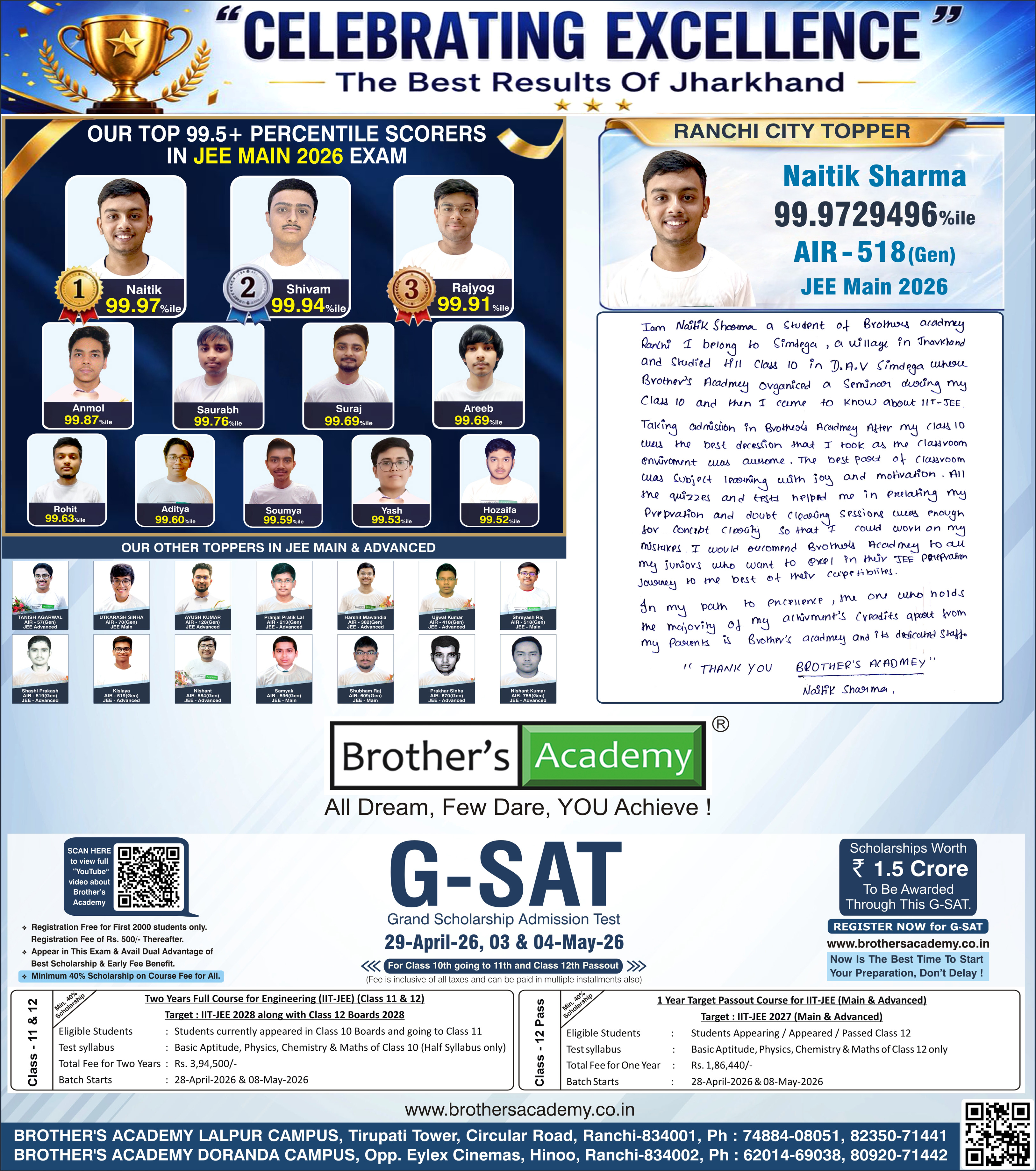 Brother's Academy is a Premier coaching Institute in Ranchi that was started in December-2011 with the noble idea of providing quality education and the best coaching facilities to students of Jharkhand and Bihar. The foundation was laid by Renowned faculties Paras Kumar Agarwal Sir, Prem Prasoon Sir and Shubhendu Shekhar Sir. With a legacy of over 14 years, Brother's Academy has pioneered competitive exam preparation. We have been at the forefront in preparing students to achieve their goals of cracking Engineering entrance examinations. With our expert faculty and unmatched study material, Brother's Academy produces top rankers in IIT-JEE, Olympiad, 10th and 12th Boards every year.Ours is a value system that runs on Truth, Dedication & Hard Work. We firmly believe that to build a strong structure we need to have a very solid foundation and we, at Brother's Academy have worked very hard on it. We feel proud today that we have earned a separate identity in the crowd of this city. All this has been possible through the hard work of our team, dedicated labour of our students and the trust & faith that their parents have shown in us. We are also committed towards the upliftment of teaching standards in the city and this is the reason we decided to make a very separate space for us in the society.